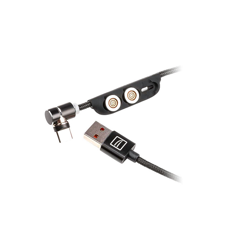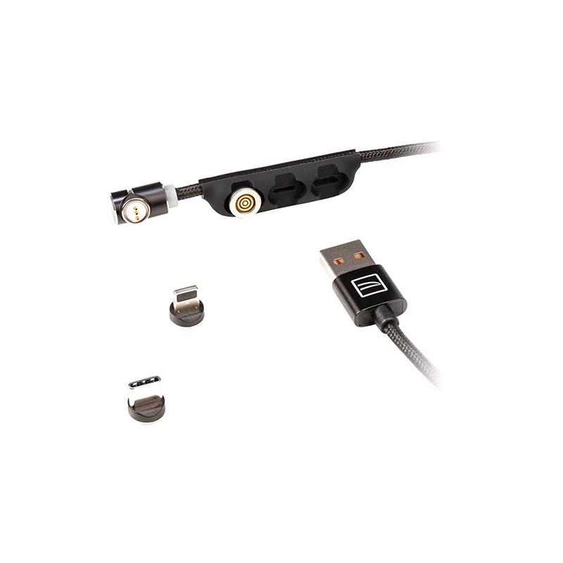 Câble USB 3 en 1 en nylon pour le chargement et la synchronisation des données, doté de connecteurs magnétiques interchangeables, Lightning, Type-C et MicroUSB. Idéal pour ceux qui ont plusieurs appareils avec des connecteurs différents, le câble 3 en 1 avec connecteurs magnétiques, est long de 2 m. La boîte à pince pratique à fixer sur le câble vous permet de garder en ordre les trois connecteurs.