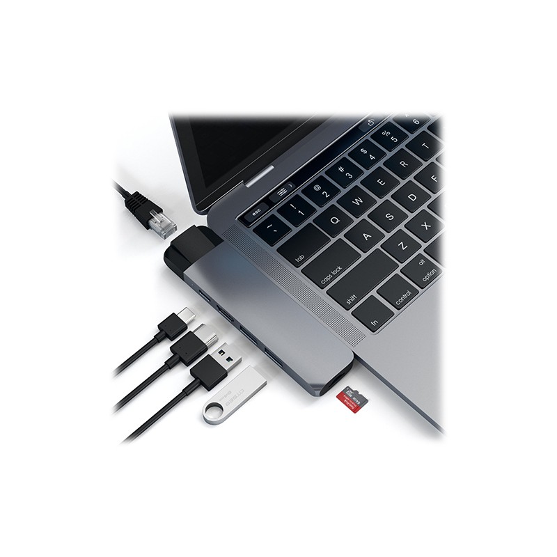 Conçu exclusivement pour les modèles MacBook Pro 13 ”et 15” 2016/2017/2018. Doté d’un port Ethernet Gigabit, d’une alimentation USB-C Power Delivery (jusqu’à 87 W), de 2 ports USB 3.0 et d’un emplacement pour carte micro SD, ce hub répondra à tous vos besoins en matière de transfert de données. Avec sa finition en aluminium brossé, le hub Type-C Pro avec Ethernet complète vos accessoires Apple et complète la configuration de votre bureau. Simplement, branchez et admirez l'étendu des capacités de votre MacBook Pro.