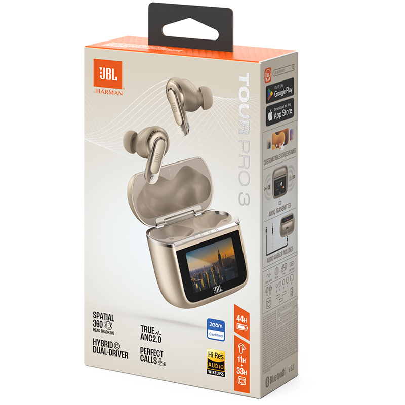 Préparez-vous pour les écouteurs sans fil les plus intelligents à ce jour. Les écouteurs JBL Tour Pro 3 sont livrés dans un étui de recharge intelligent Smart Charging Case™ récemment repensé, doté d’un écran tactile pratique avec encore plus de fonctionnalités, qui vous donne un contrôle total sur votre expérience d’écoute, alors que votre téléphone reste dans votre poche. Connectez-vous en toute transparence à n’importe quel appareil Bluetooth® et plongez-vous dans votre musique, vos films et vos jeux grâce au son JBL Spatial 360 avec suivi des mouvements de la tête. Les écouteurs JBL Tour Pro 3 sont également équipés du légendaire son JBL Pro haute résolution (Hi-Res). Quand il est temps de vous mettre au travail, isolez-vous du monde grâce à la Véritable Réduction de Bruit Adaptative en temps réel. En vol, utilisez l’étui Smart Charging Case™ comme dongle d’émetteur audio, afin de vous connecter sans fil au système en vol (ou PC) et profiter d’une expérience sonore cinématographique pendant que vous êtes dans les airs. Ou à votre bureau, connectez facilement l’étui de recharge intelligent Smart Charging Case™ à votre ordinateur, pour une qualité d’appel parfaite.