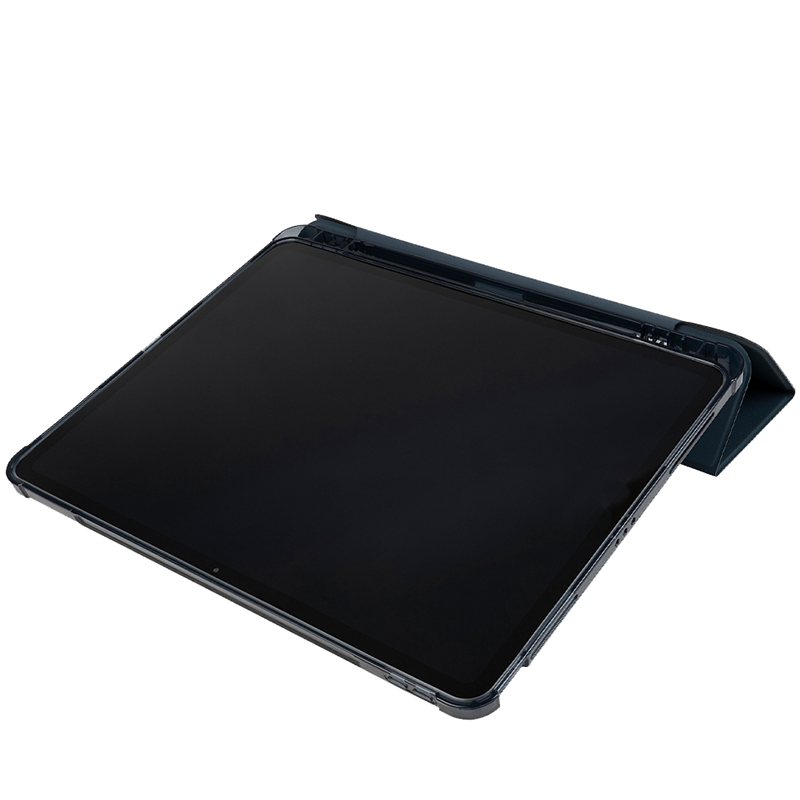 Étui ultra-protecteur pour iPad Air 13" M2/M3, partiellement fabriqué à partir de plastique recyclé, avec face avant en matériau satiné, convertible en position debout. La coque arrière antichoc est en polycarbonate transparent doublement injecté, complétée par un bord périphérique en TPU pour faciliter l'insertion de l'iPad. La housse en satin est équipée d'un compartiment interne pour le Tucano Pencil et l'Apple Pencil. Approuvé par la norme militaire.