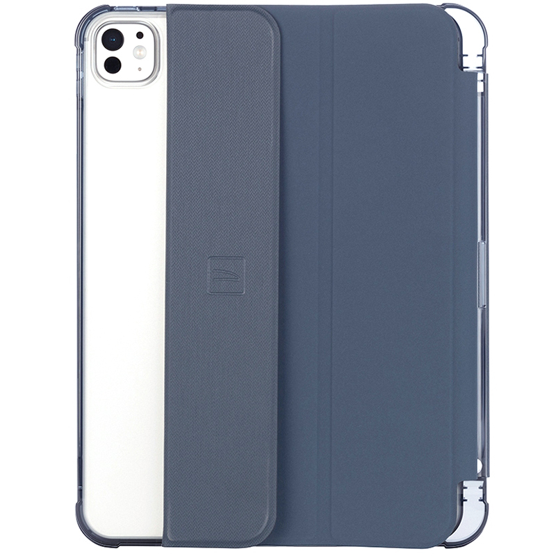 Étui ultra-protecteur pour iPad Pro 11" M4 2024, partiellement fabriqué à partir de plastique recyclé, avec face avant en matériau satiné, convertible en position debout. La coque arrière antichoc est en polycarbonate transparent doublement injecté, complétée par un bord périphérique en TPU pour faciliter l'insertion de l'iPad. La housse satinée est équipée d'un compartiment interne pour le Tucano Pencil at Apple Pencil. Approuvé par la norme militaire.