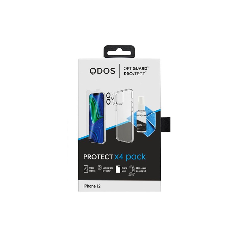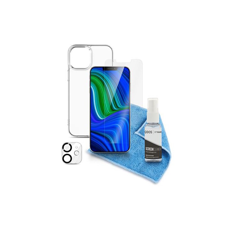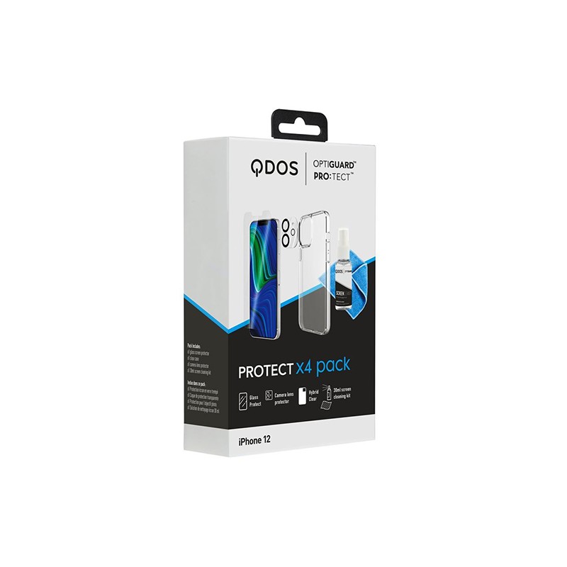 Offrez à votre iPhone 12 les meilleurs accessoires avec ce pack composé des best-sellers QDOS ! La coque ultra-transparente QDOS Hybrid est composée d’un dos en polycarbonate ultra-résistant et de bordures souples avec des coussinets d’angles qui amortissent les chutes. La protection écran OptiGuard Glass Protect est composée d’un verre premium d’origine japonaise offrant un indice de résistance 9H contre les chocs et les rayures tandis que L'OptiGuard protège l'objectif de la caméra de votre iPhone 12 de manière discrète et efficace, en offrant une couverture complète en verre trempé dans une solution adaptée à la coque. Le revêtement oléophobe avec des découpes de précision et des bords intérieurs noirs garantit que la qualité de vos photos reste limpide. L’ensemble est complété par un spray nettoyant pour écran et une microfibre.