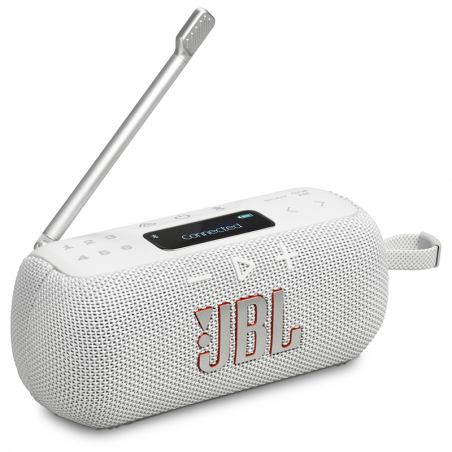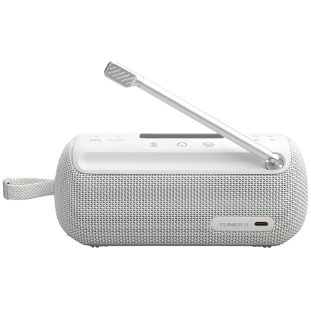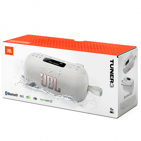 Une radio au son cristallin où que vous soyez. Laissez place au divertissement et offrez-vous une nouvelle expérience radio engageante. Notre radio portable et puissante JBL Tuner 3 nous permet de profiter pleinement de nos stations de radio DAB/DAB+/FM préférées et de la diffusion en Bluetooth, offrant le son JBL Pro clair et imposant, que ce soit en cuisine, au bord de la piscine, en camping ou partout où l’ambiance nous mène. Nous savons qu’elle va améliorer votre expérience d’écoute. Préparez-vous à monter le volume. Étant donné que nous avons augmenté la puissance du haut-parleur, la JBL Tuner 3 offre un son suffisamment puissant pour remplir n’importe quel espace d’un son immaculé et réaliste. C’est notre radio la plus puissante à ce jour. Préréglez vos six stations préférées pour les avoir toujours à portée de main. Nous aimons également parcourir les ondes hertziennes pour voir quelles surprises nous attendent sur le grand écran LCD dégagé. Dans tous les cas, vous avez jusqu’à 15 heures d’autonomie musicale avec la fonction Playtime Boost avant de devoir mettre l’appareil en charge. Emportez-la partout avec vous, à l’intérieur comme en extérieur, grâce à sa boucle robuste. Que vous écoutiez la radio pendant votre routine beauté dans la salle de bains ou sur une plage de sable blanc, sa conception étanche à l’eau et à la poussière peut faire face à presque toutes les conditions. Trouvez votre propre nouvelle station avec la JBL Tuner 3.