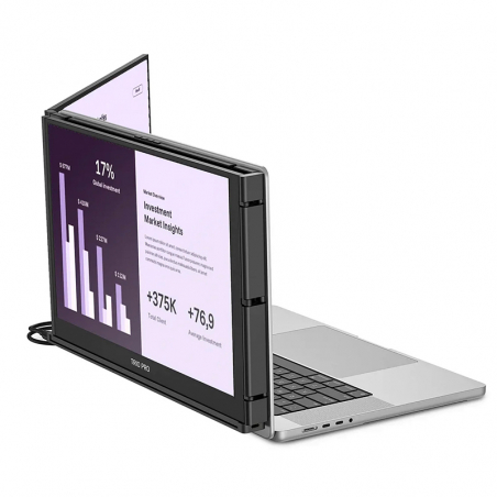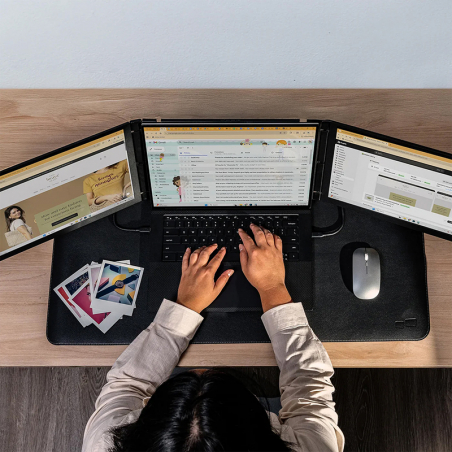 Le Trio 3 Pro est la solution idéale pour les professionnels qui ont besoin de plus d’espace de travail sans sacrifier la mobilité. Ce système comprend 2 moniteurs QHD (2560x1440) qui se fixent à votre ordinateur portable, pour créer une configuration à triple écran avec votre laptop. Vous bénéficiez d’un flux de travail plus efficace, de couleurs précises (100 % sRGB), d’angles ajustables et d’un traitement antireflet pour réduire la fatigue visuelle.