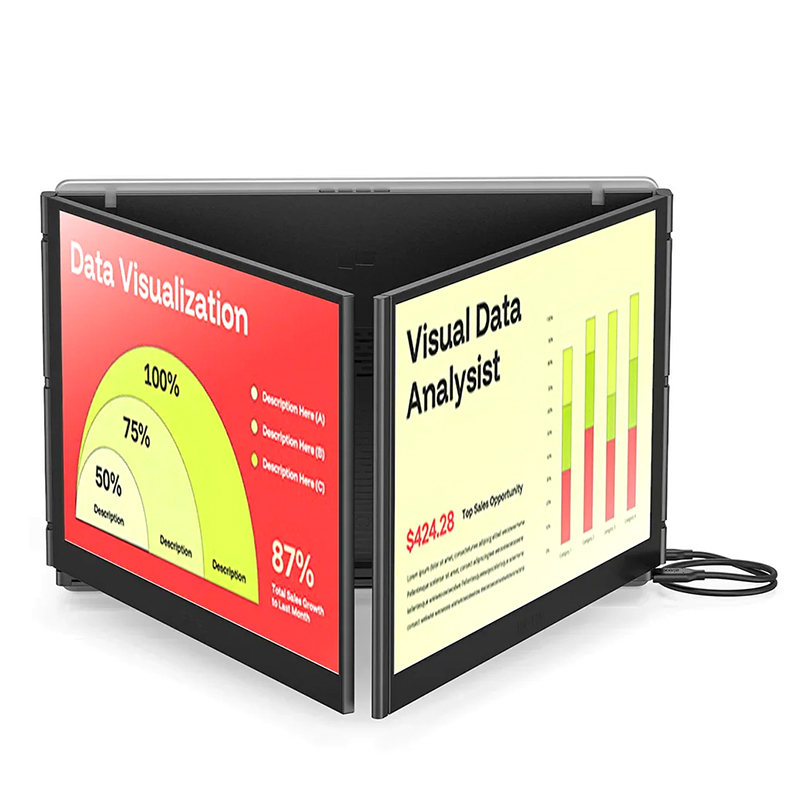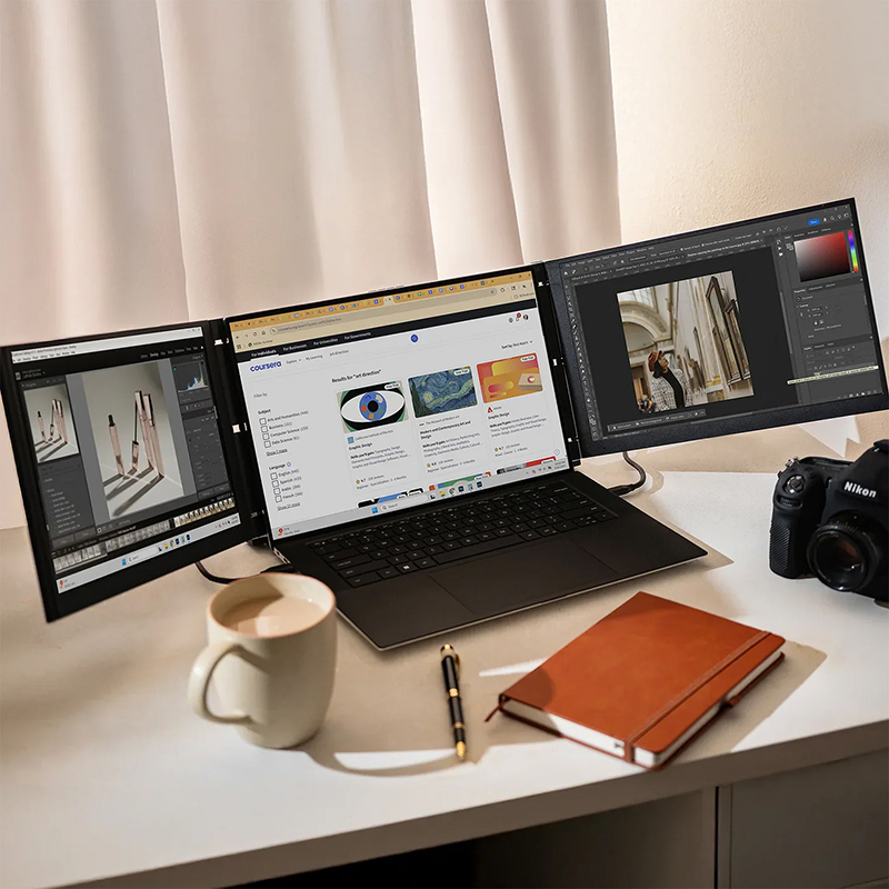 Conçu pour être ultraportable et robuste, chaque écran ne pèse qu’environ 600 g, se replie facilement et se transporte sans effort avec votre ordinateur. Le Trio 3 Pro est alimenté par votre appareil via USB-C / USB-A et ne possède pas de batterie intégrée.