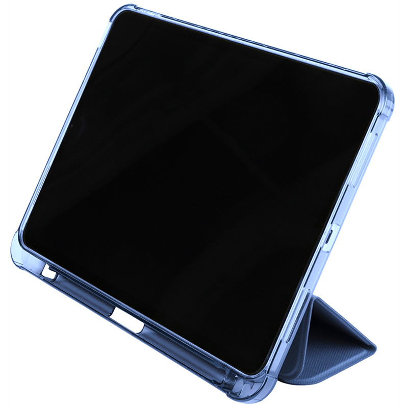 Folio ultra-protecteur pour le nouvel iPad 10/11, dont une partie est fabriquée en plastique recyclé. Le rabat présente un matériau à effet satiné et se transforme en un support pratique. La coque arrière antichoc est fabriquée en polycarbonate transparent doublement injecté et bordée de TPU pour faciliter l'insertion de l'iPad. La housse satinée dispose d'un emplacement interne pour ranger votre Apple Pencil et d'un support externe pour le recharger. Testé selon les normes militaires et approuvé.