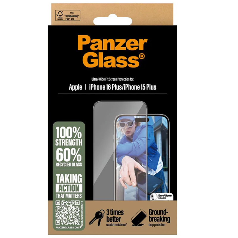 Et la protection de l'écran ? Elle est exceptionnelle ! Grâce à une résistance élevée aux rayures, ce protecteur d'écran protège l'écran de votre téléphone contre les chocs accidentels, les chutes brutales et les autres risques de la vie quotidienne. En d'autres termes, il prolonge la durée de vie de votre téléphone : Il prolonge la durée de vie de votre téléphone, repoussant ainsi le besoin de produire de nouveaux téléphones. C'est une façon d'œuvrer pour un avenir plus durable. Un autre moyen consiste à utiliser moins d'emballages : En 2024, nous avons réduit de 66 % en moyenne la quantité de papier utilisée dans la conception de l'emballage de nos produits de base PanzerGlass®. Et comme tous nos produits, il est livré dans une boîte recyclable certifiée FSC™.