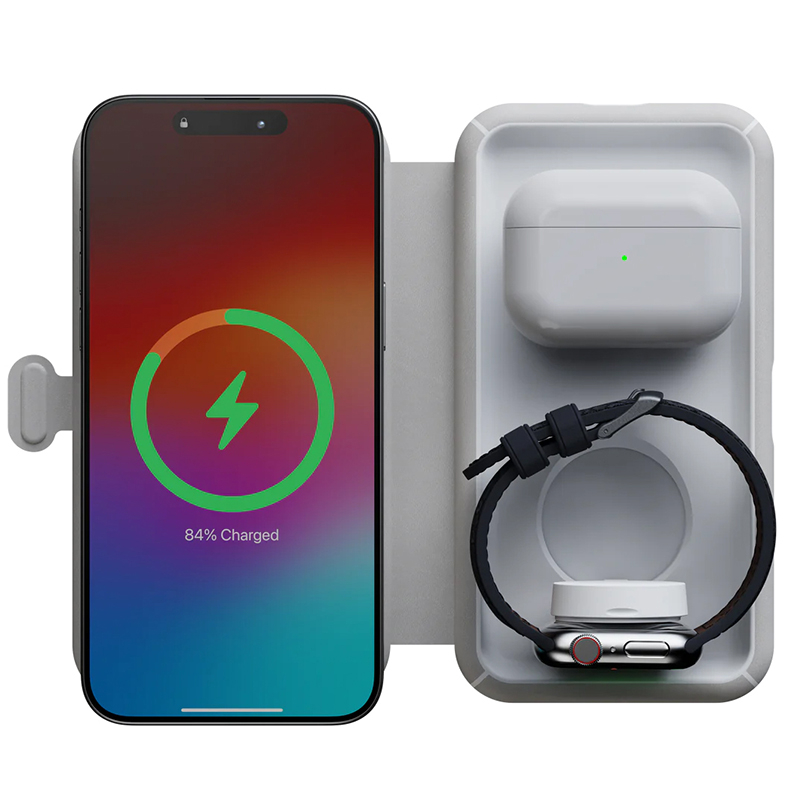 Chargez simultanément tous vos appareils quotidiens avec ce chargeur de voyage pliable 3-en-1. Avec une seule prise de courant et cette station de charge compacte, vous pouvez charger votre iPhone, votre Apple Watch et vos AirPods !