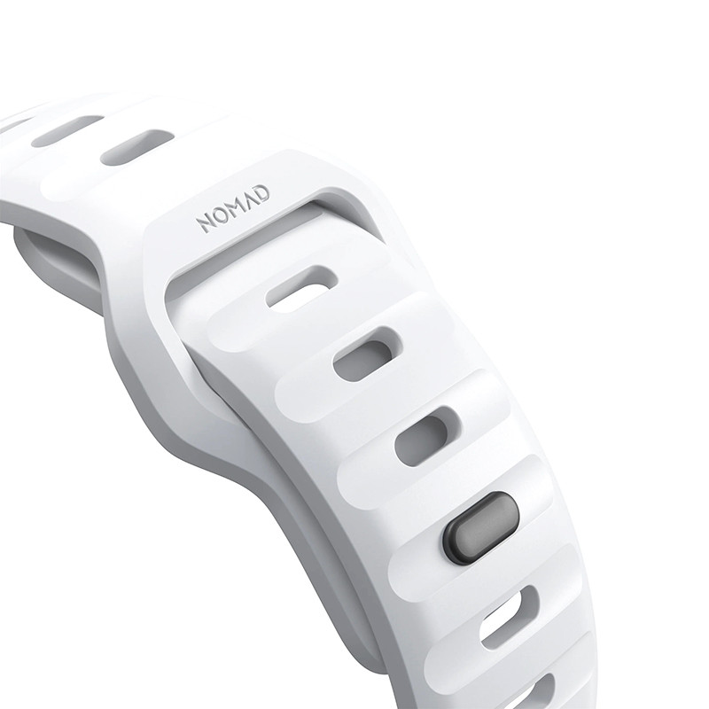 Le bracelet Sport de Nomad est entièrement moulé à partir de silicone LSR durable, un matériau naturellement biocompatible, antimicrobien et hypoallergénique, qui permet un porté doux, sûr et confortable autour du poignet.