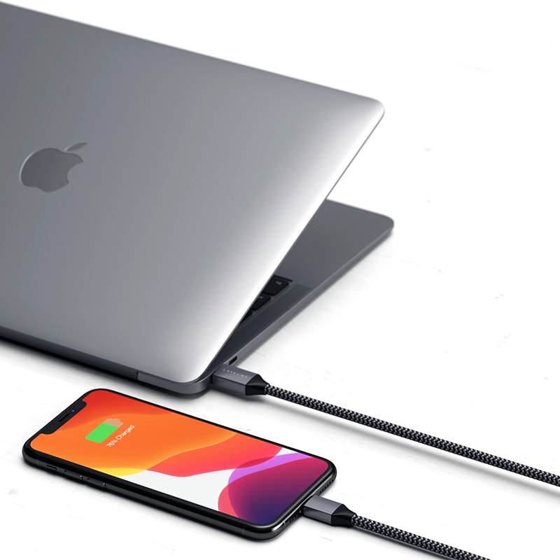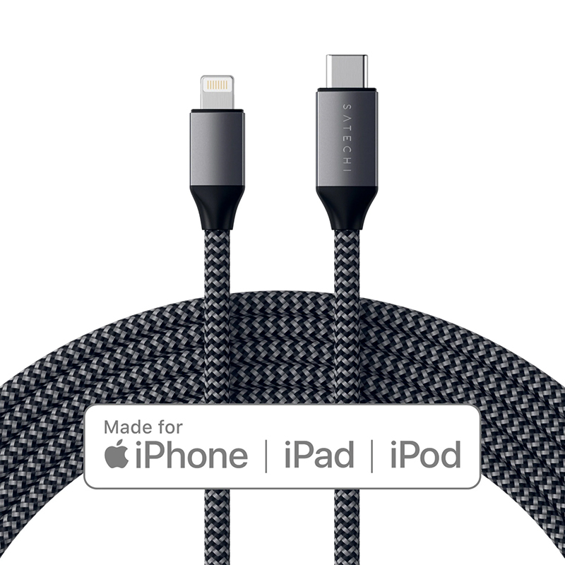 Voici le câble de charge Satechi USB-C vers Lightning doté de la certification MFi, d'une longueur de cordon étendue et d'un design tressé élégant pour alimenter vos appareils Apple iOS en toute simplicité. Chargez confortablement - depuis votre lit ou votre canapé, grâce à sa longueur de câble étendue de 1,8 m pour une charge pratique et puissante où que vous soyez.