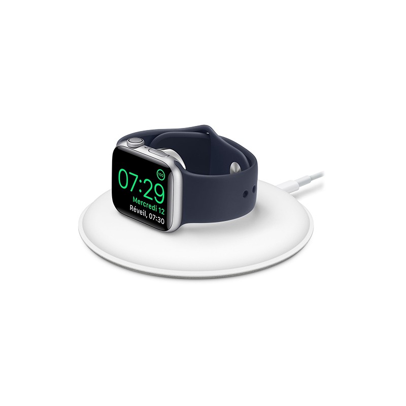 La Station de charge magnétique pour Apple Watch vous permet de recharger votre Apple Watch à plat, le bracelet ouvert, ou sur le côté. Lorsqu’elle est placée sur le côté, votre montre se met automatiquement en mode Table de nuit, afin que vous puissiez l’utiliser comme réveil. La Station de charge magnétique pour Apple Watch est dotée du même connecteur de charge par induction que celui de l’Apple Watch. Elle permet de recharger tous les modèles et toutes les tailles d’Apple Watch. Et elle se connecte au moyen du Câble Lightning vers USB et de l’Adaptateur secteur USB de 5 W Apple.