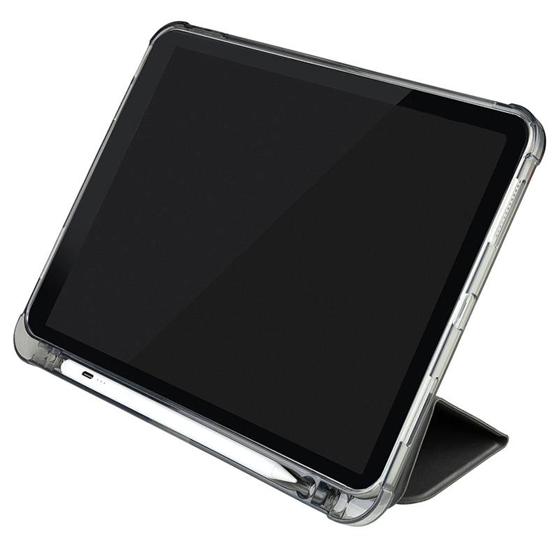 Étui ultra-protecteur pour iPad Air 11" M2/M3, partiellement fabriqué à partir de plastique recyclé, avec face avant en matériau satiné, convertible en position debout. La coque arrière antichoc est en polycarbonate transparent doublement injecté, complétée par un bord périphérique en TPU pour faciliter l'insertion de l'iPad. La housse en satin est équipée d'un compartiment interne pour le Tucano Pencil et l'Apple Pencil. Approuvé par la norme militaire.