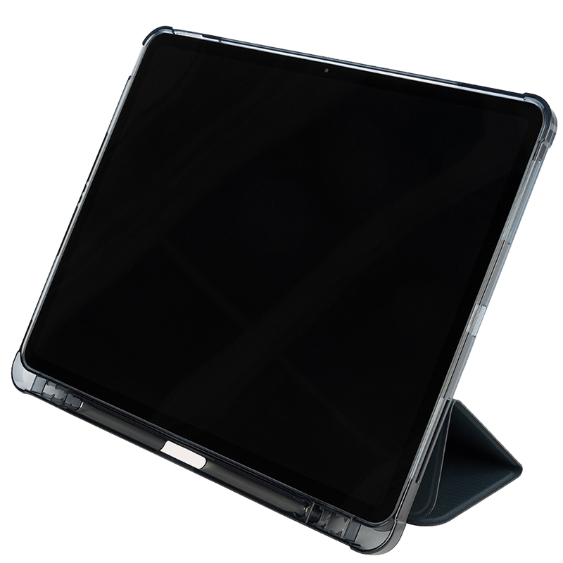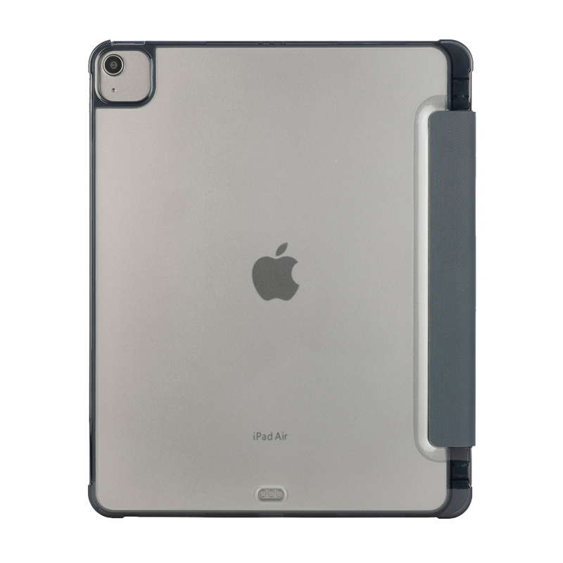 Étui ultra-protecteur pour iPad Air 13" M2/M3, partiellement fabriqué à partir de plastique recyclé, avec face avant en matériau satiné, convertible en position debout. La coque arrière antichoc est en polycarbonate transparent doublement injecté, complétée par un bord périphérique en TPU pour faciliter l'insertion de l'iPad. La housse en satin est équipée d'un compartiment interne pour le Tucano Pencil et l'Apple Pencil. Approuvé par la norme militaire.