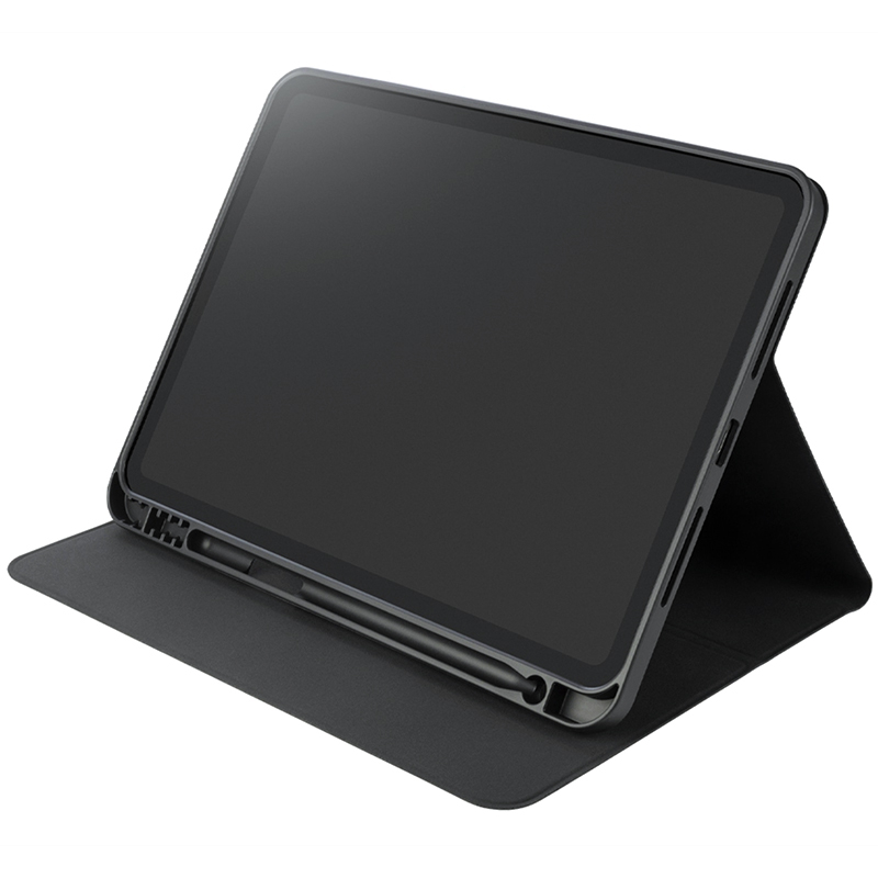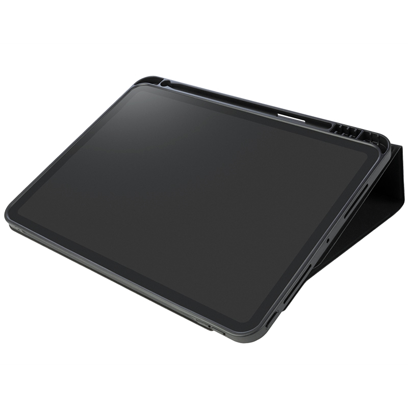 Étui pour iPad Air 11" M2/M3 en PU effet nylon avec coque arrière semi-rigide et intérieur anti-rayures, transformable en un support pratique pour différentes positions d'utilisation. Trou pour la caméra à l'arrière et compartiment pour le Tucano Pencil ou l'Apple Pencil à l'intérieur.