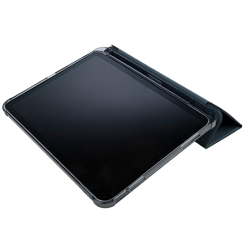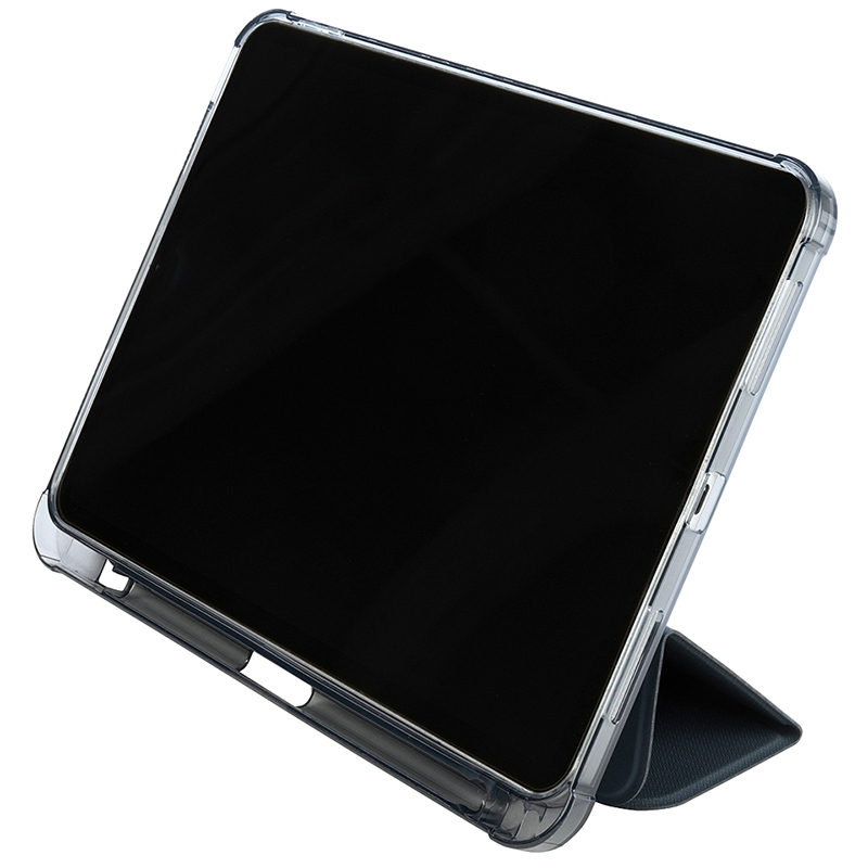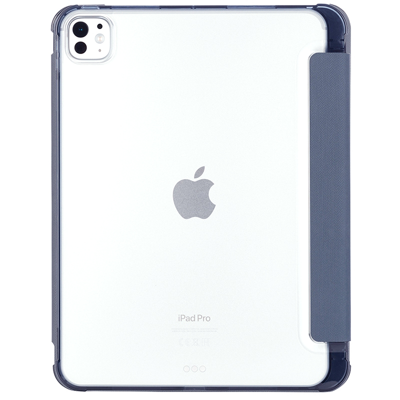 Étui ultra-protecteur pour iPad Pro 11" M4 2024, partiellement fabriqué à partir de plastique recyclé, avec face avant en matériau satiné, convertible en position debout. La coque arrière antichoc est en polycarbonate transparent doublement injecté, complétée par un bord périphérique en TPU pour faciliter l'insertion de l'iPad. La housse satinée est équipée d'un compartiment interne pour le Tucano Pencil at Apple Pencil. Approuvé par la norme militaire.