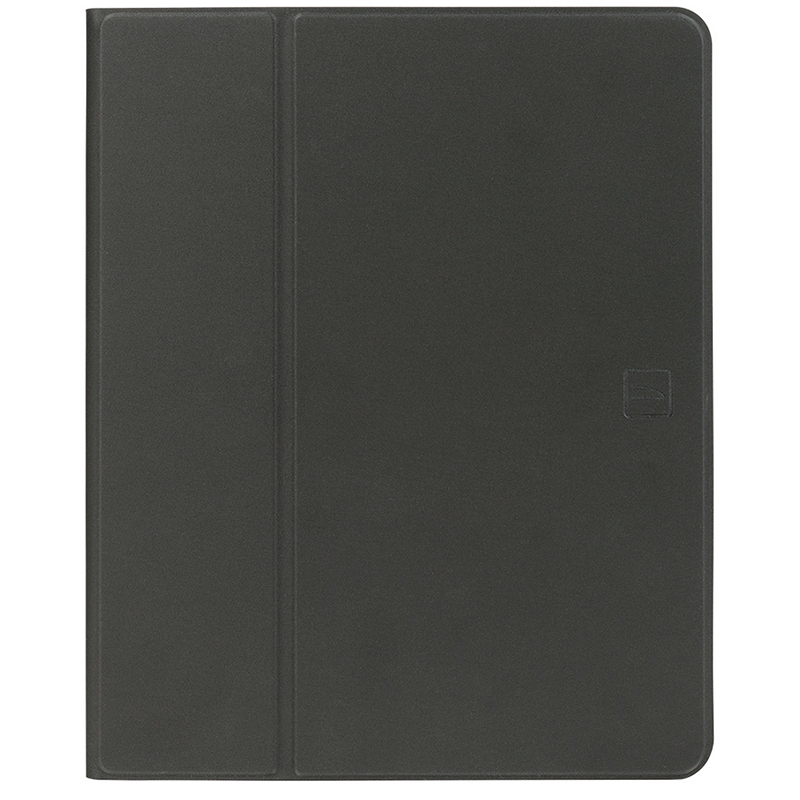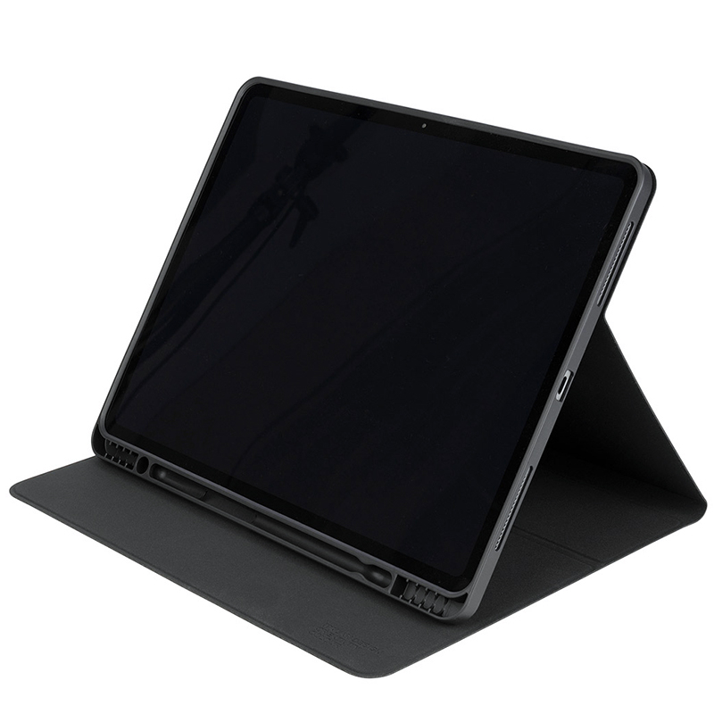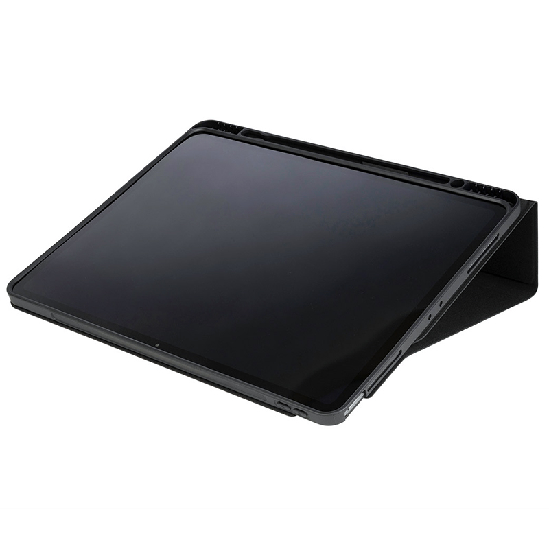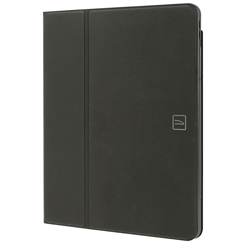 Étui pour iPad Pro 13" M4 (2024) en PU effet nylon avec coque arrière semi-rigide et intérieur anti-rayures, transformable en un support pratique pour différentes positions d'utilisation. Trou pour la caméra à l'arrière et compartiment pour le Tucano Pencil ou l'Apple Pencil à l'intérieur.