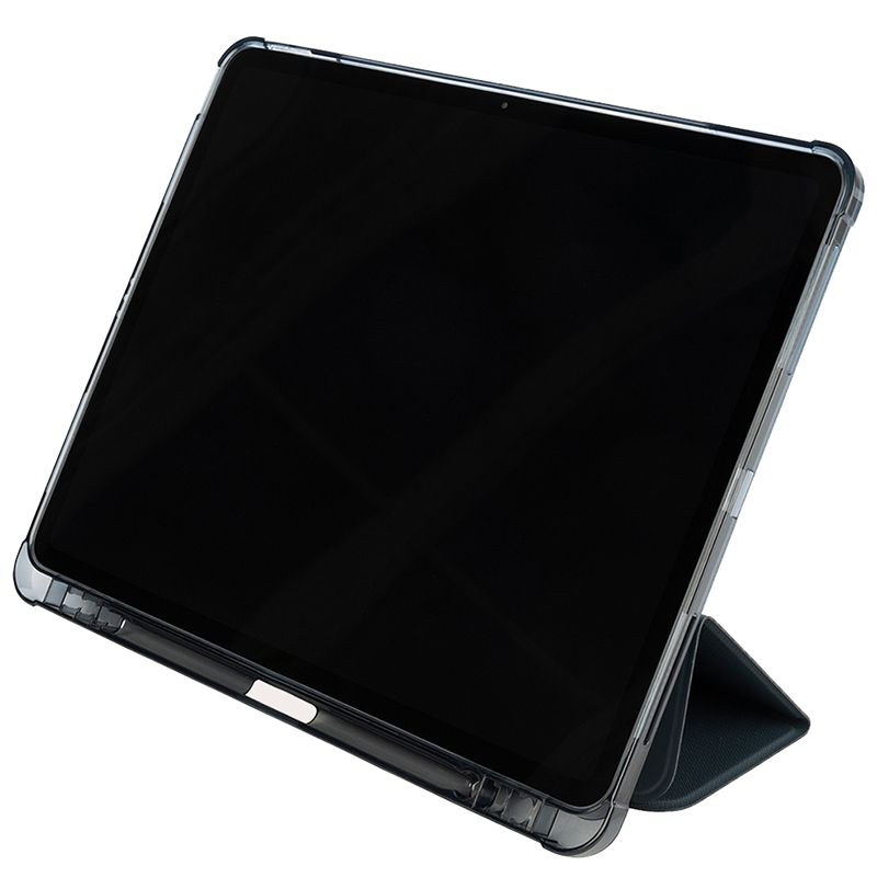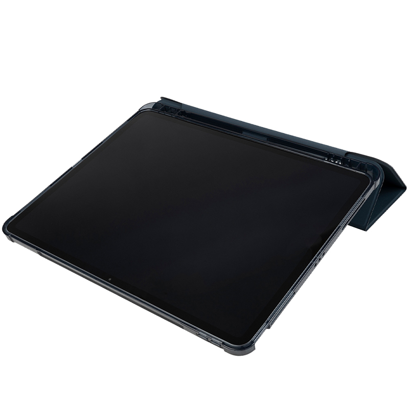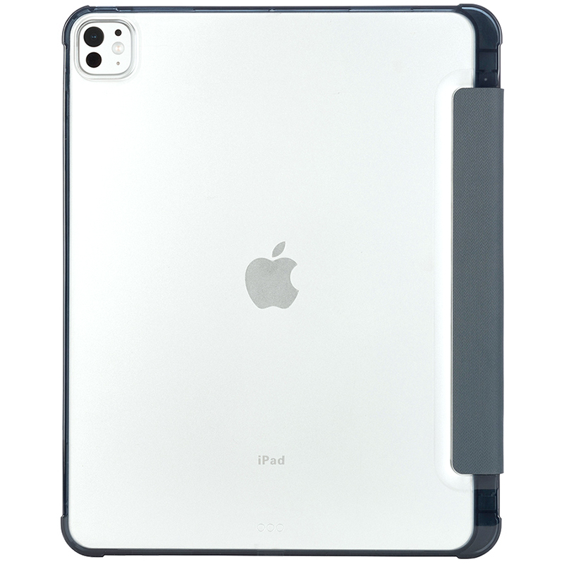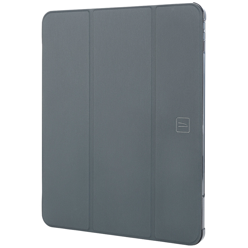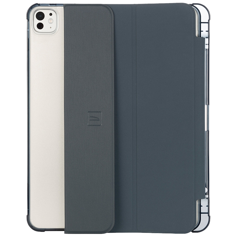 Étui ultra-protecteur pour iPad Pro 13" M4 2024, partiellement fabriqué à partir de plastique recyclé, avec face avant en matériau satiné, convertible en position debout. La coque arrière antichoc est en polycarbonate transparent doublement injecté, complétée par un bord périphérique en TPU pour faciliter l'insertion de l'iPad. La housse satinée est équipée d'un compartiment interne pour le Tucano Pencil at Apple Pencil. Approuvé par la norme militaire.