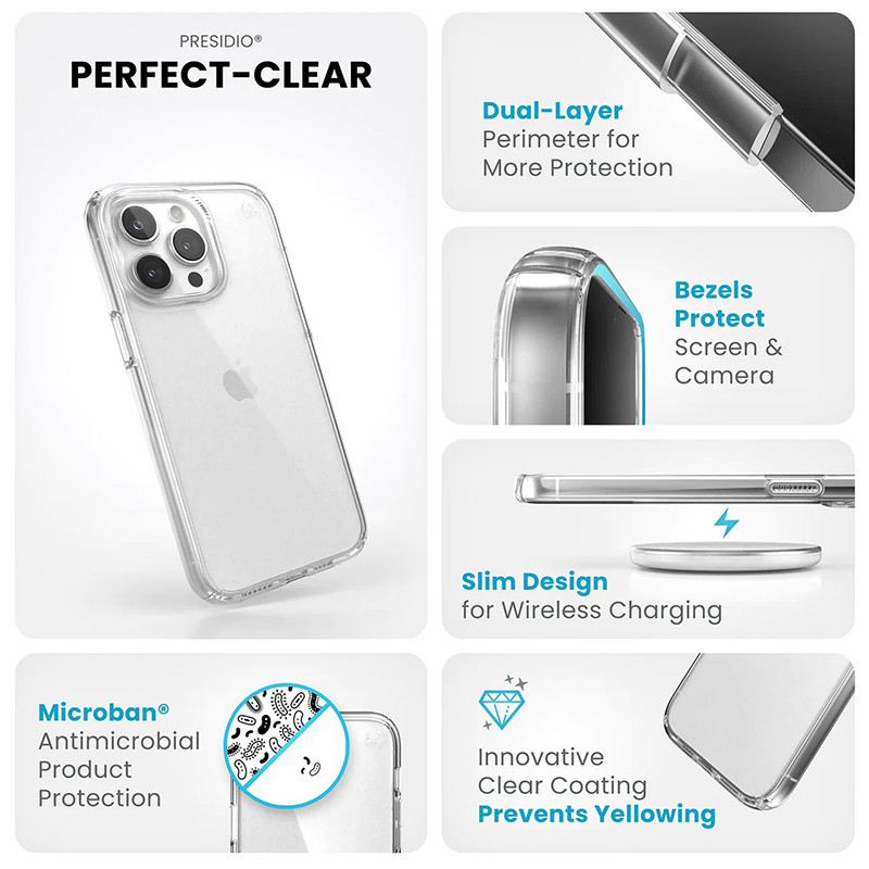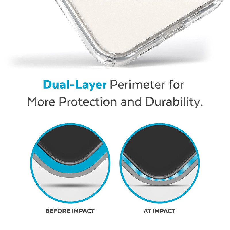 Speck Presidio Perfect-Clear est l'étui de protection et de poche le plus transparent que nous ayons jamais conçu. Nos matériaux innovants nous permettent de créer un étui qui reste parfaitement transparent plus longtemps. Hautement protecteur, mais mince, cet étui est adapté à la poche et compatible avec la recharge sans fil. Notre caoutchouc transparent exclusif, qui amortit les chocs, se comprime en cas d'impact pour protéger votre téléphone et résister aux dommages. Naturellement, notre étui Presidio Perfect-Clear a été testé dans le monde réel pour résister à des chutes allant jusqu'à 4 mètres. Il est également doté de la protection anti-microbienne Microban® qui permet de réduire de 99 % les bactéries responsables des taches et des odeurs sur l'étui, pour une surface plus propre. Ce bord supplémentaire protège votre écran des rayures, des éclats ou de la redoutable toile d'araignée si votre téléphone tombe face contre terre.
